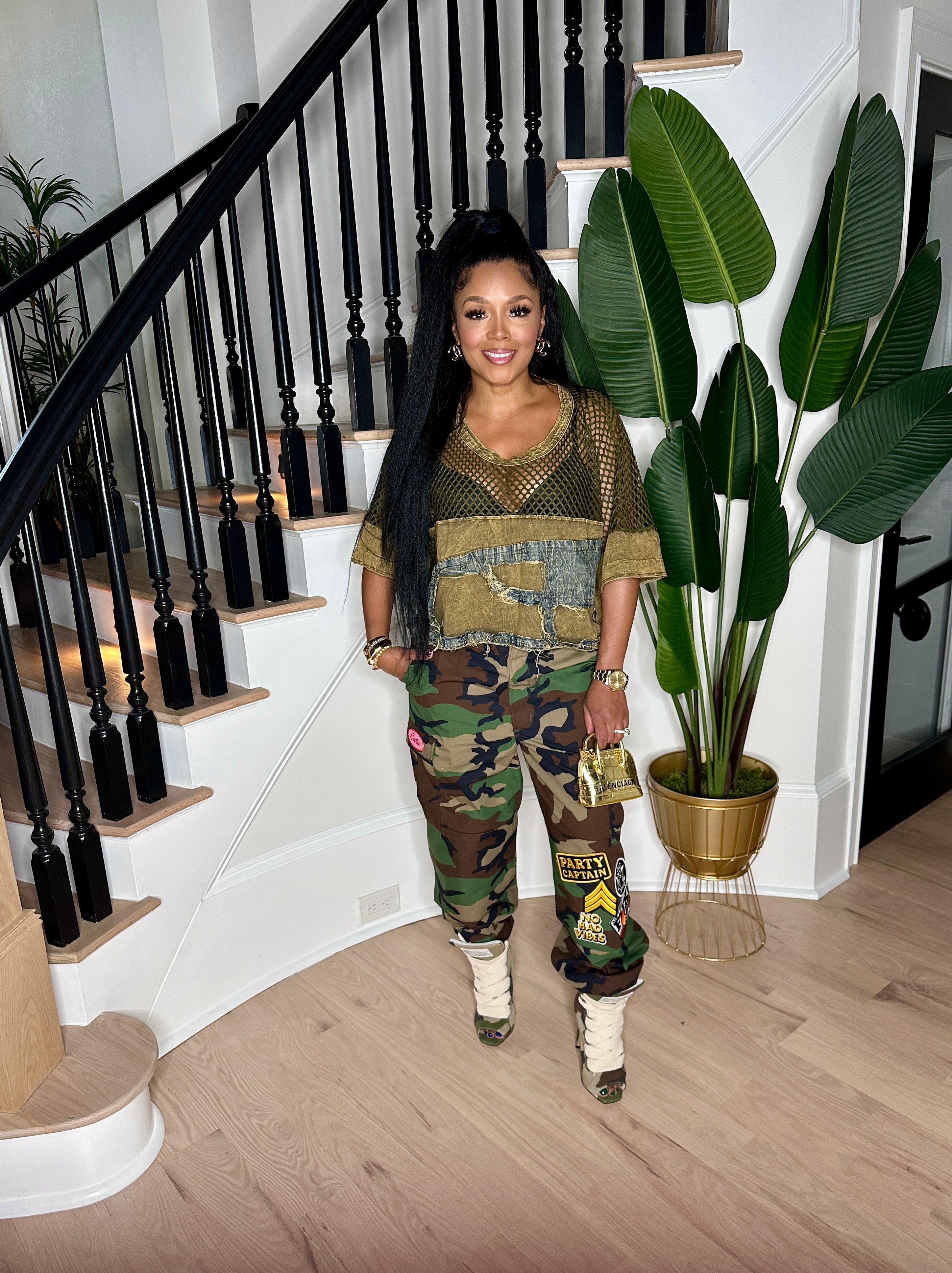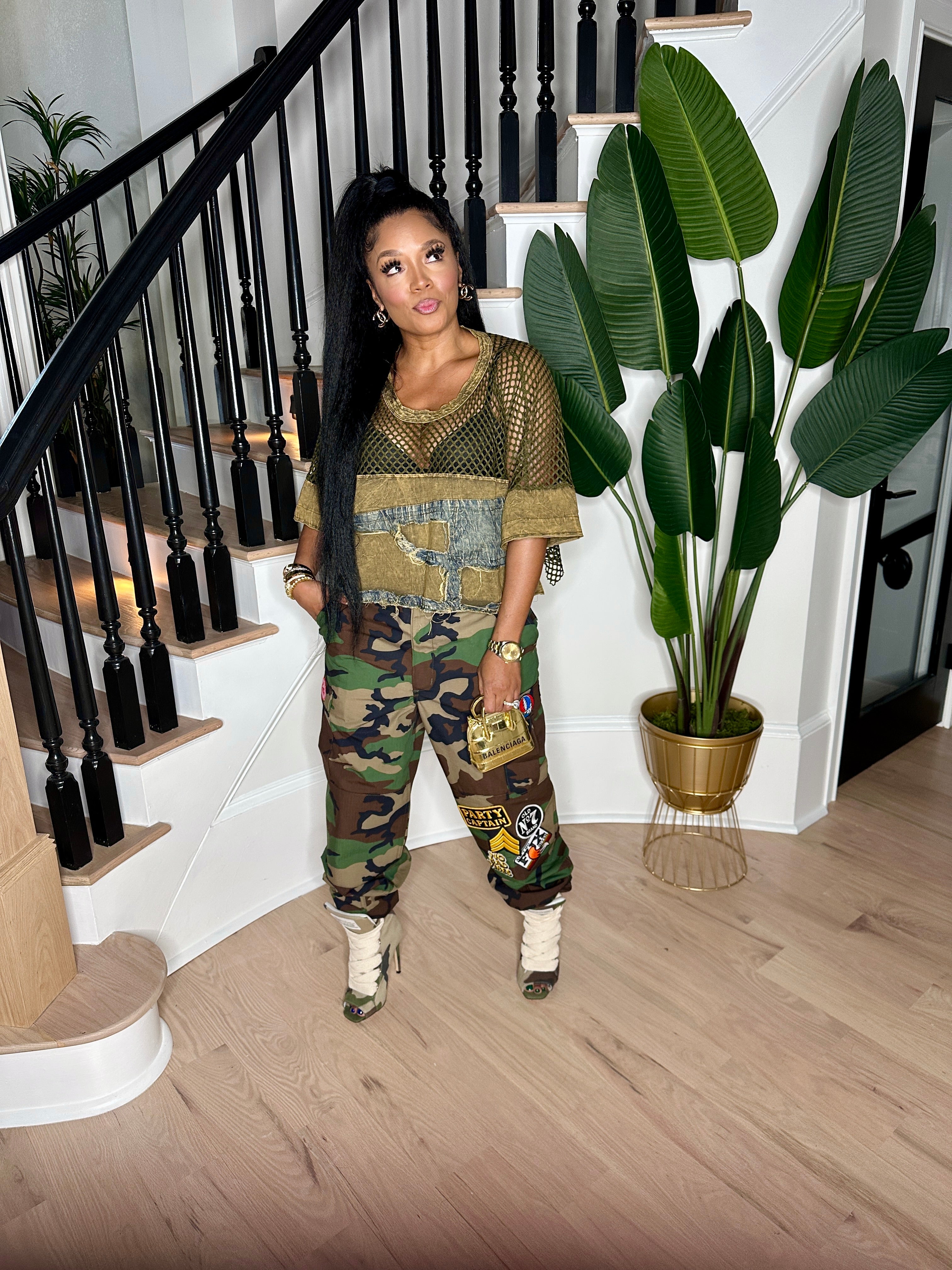 Denim & Mesh Tee: This One-Size Top features a playful contrast of textures—airy mesh panels for ventilation and rugged denim accents for structure and flair. Cotton/Polyester Paired with our Pressed Patch Camo Pants.