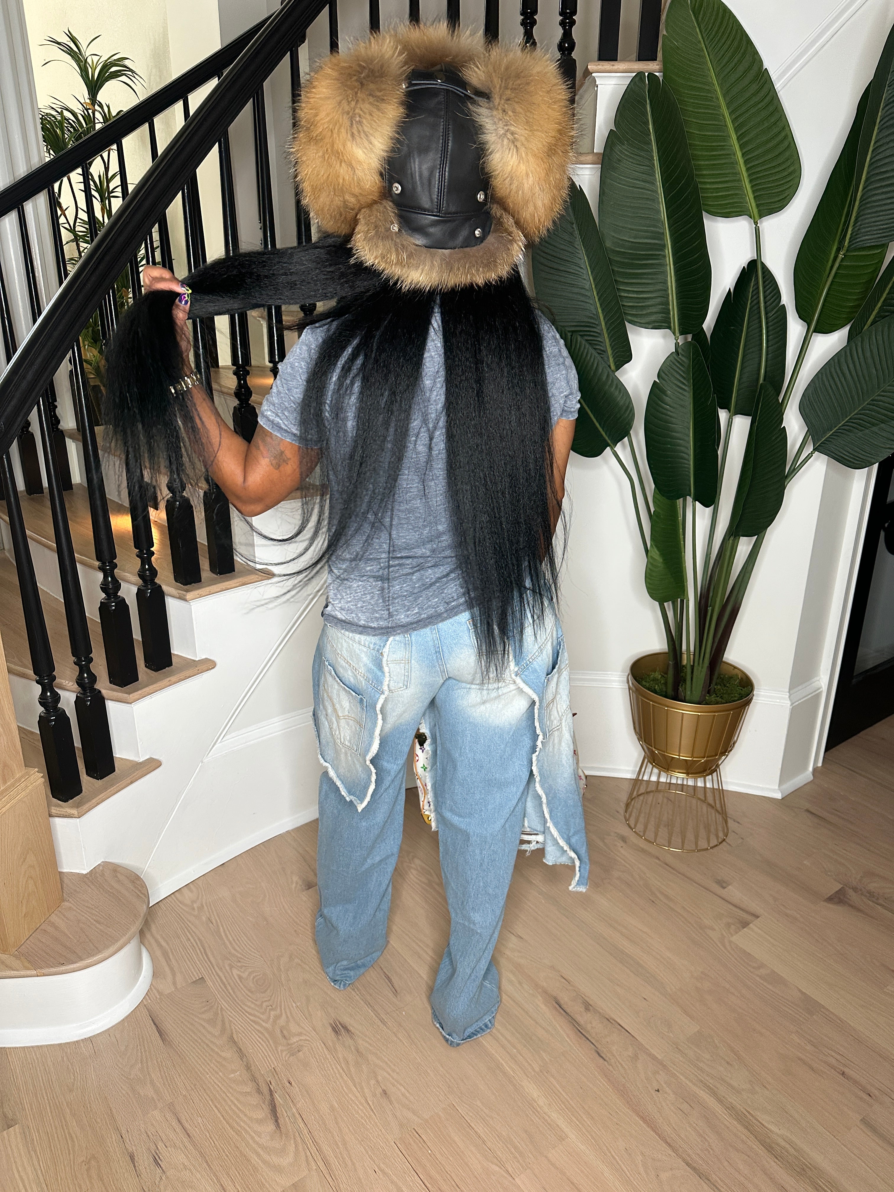 Denim on Denim Jeans: Layered style distressed denim jeans with functional pockets & baggy design. Non- Stretch 95% cotton 5% Viscose. Model is wearing size small. Paired with The Big Fur Hat