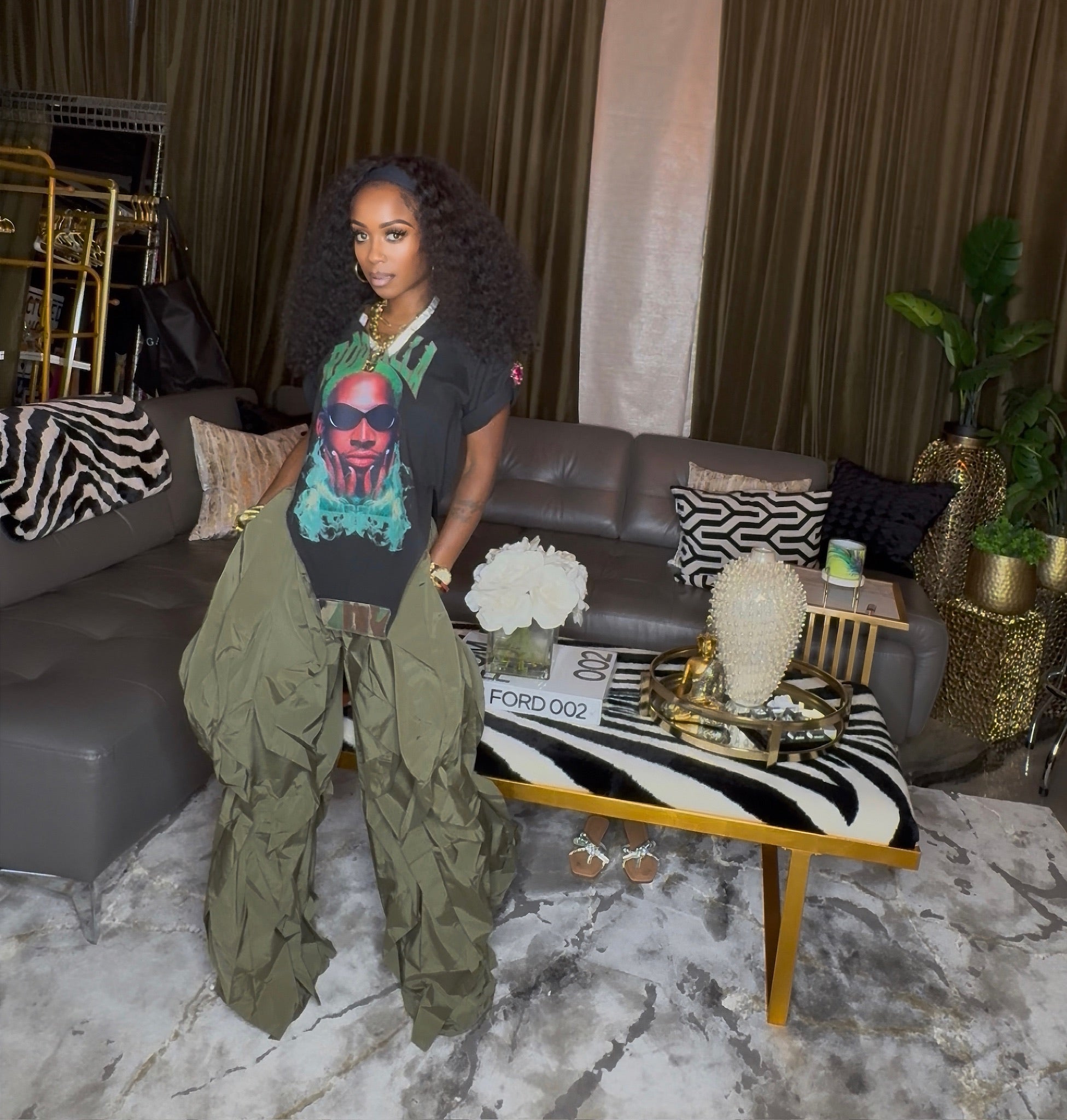 Dramatic Wide Leg Pants: 100% Polyester. These pants has a parachute vibe and paired with the custom Rodman Tee. Model is wearing a size small.