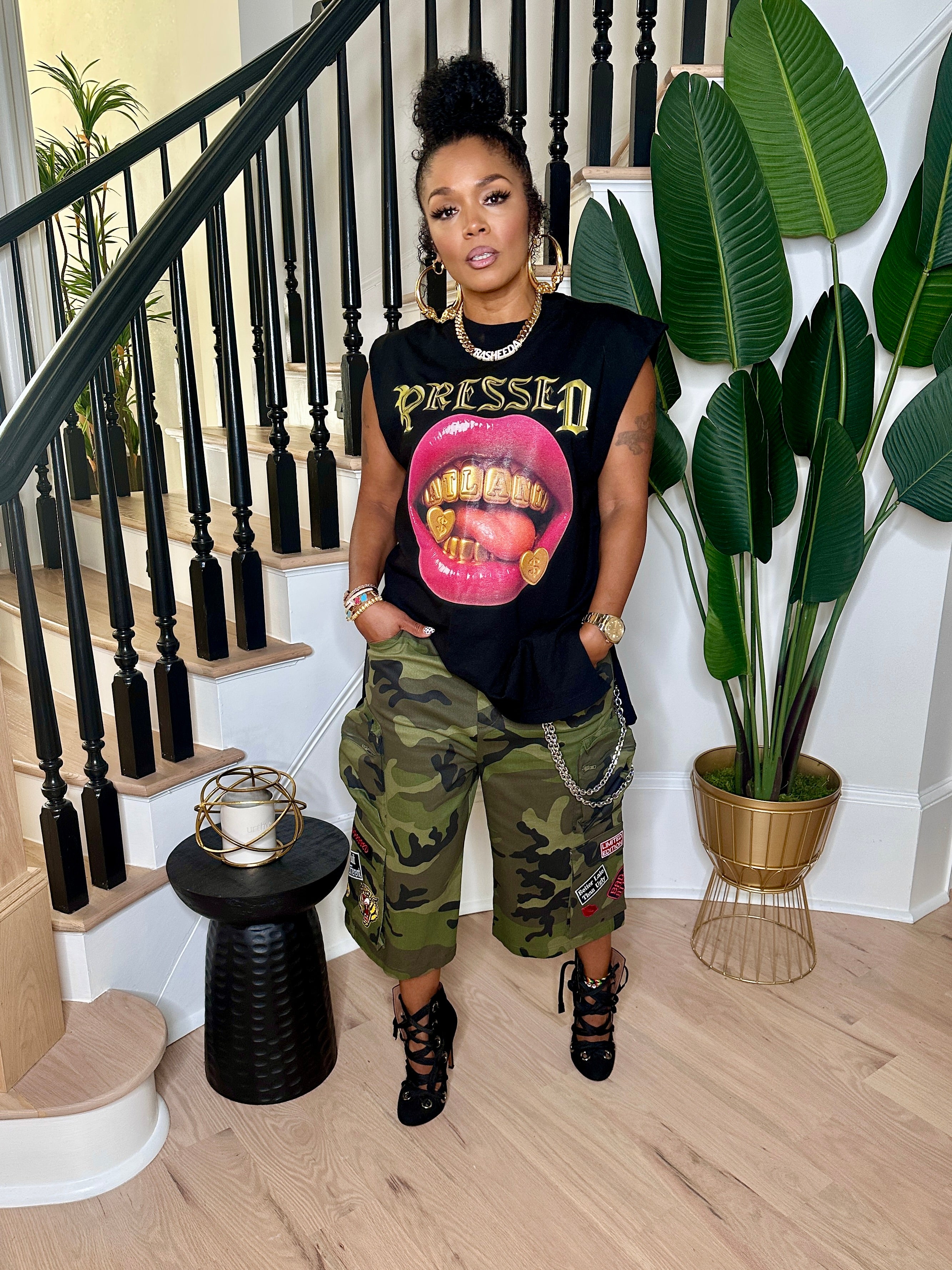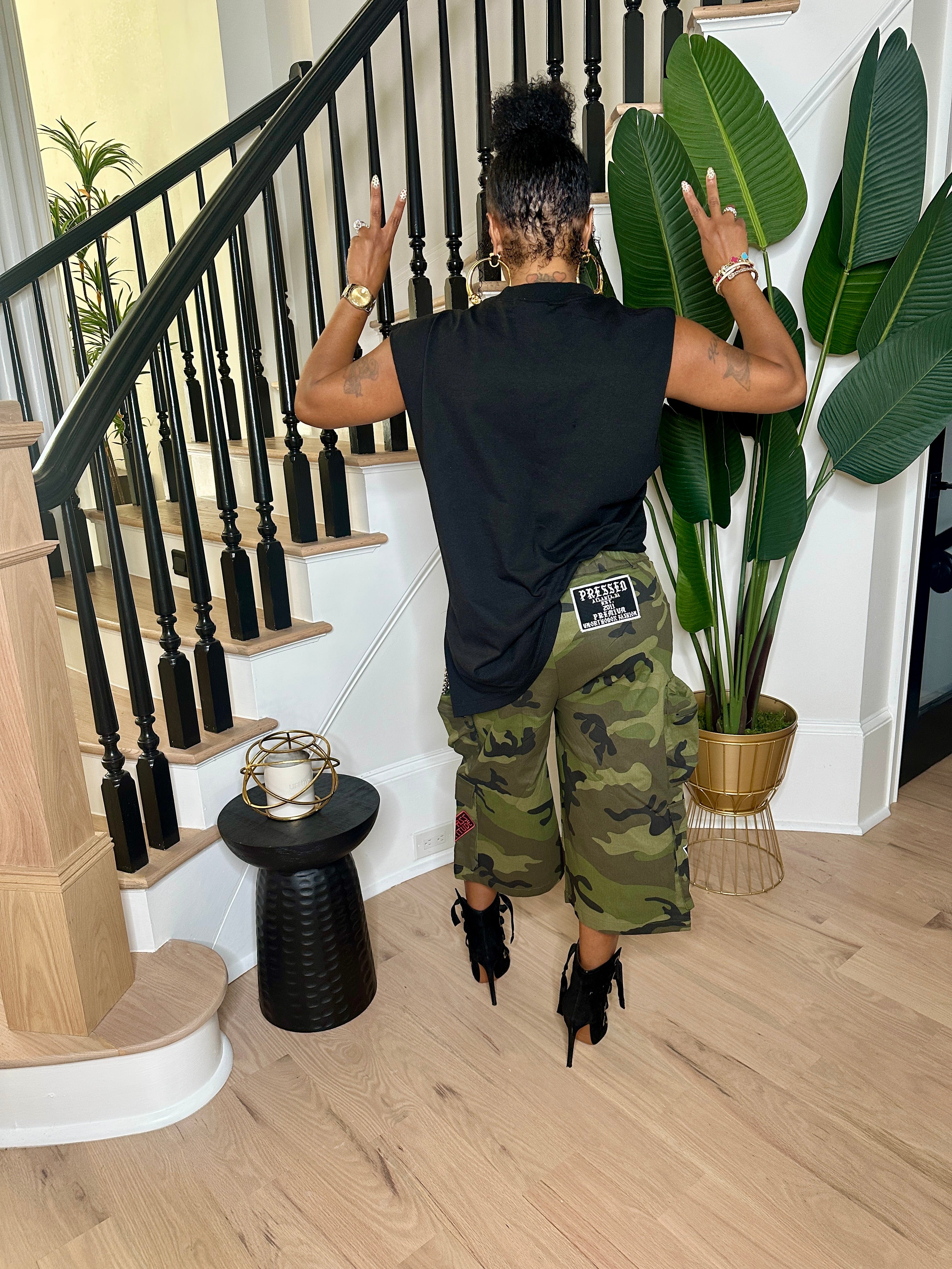 Long Camo Patch Shorts: Pressed Exclusive. Elastic waist with cargo pocket design. Pocket Chain is included. Model is wearing size small. 50 % cotton, 47% polyester, 3% spandex. Paired with our Pressed Graphic Grillz Tee 2
