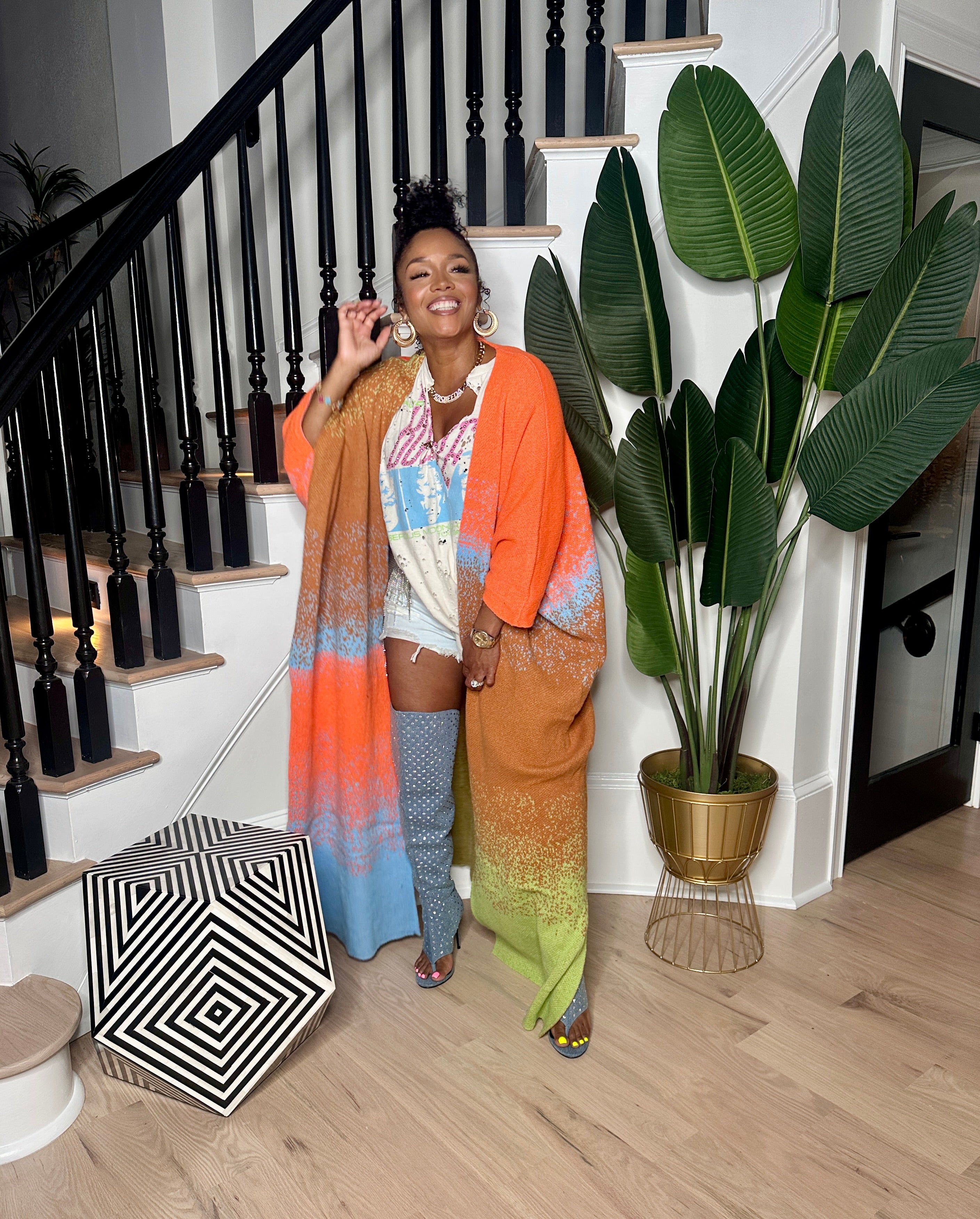 Ombre Me Sweater Coat: Great stretch, oversized, ONE SIZE. 100% polyester.