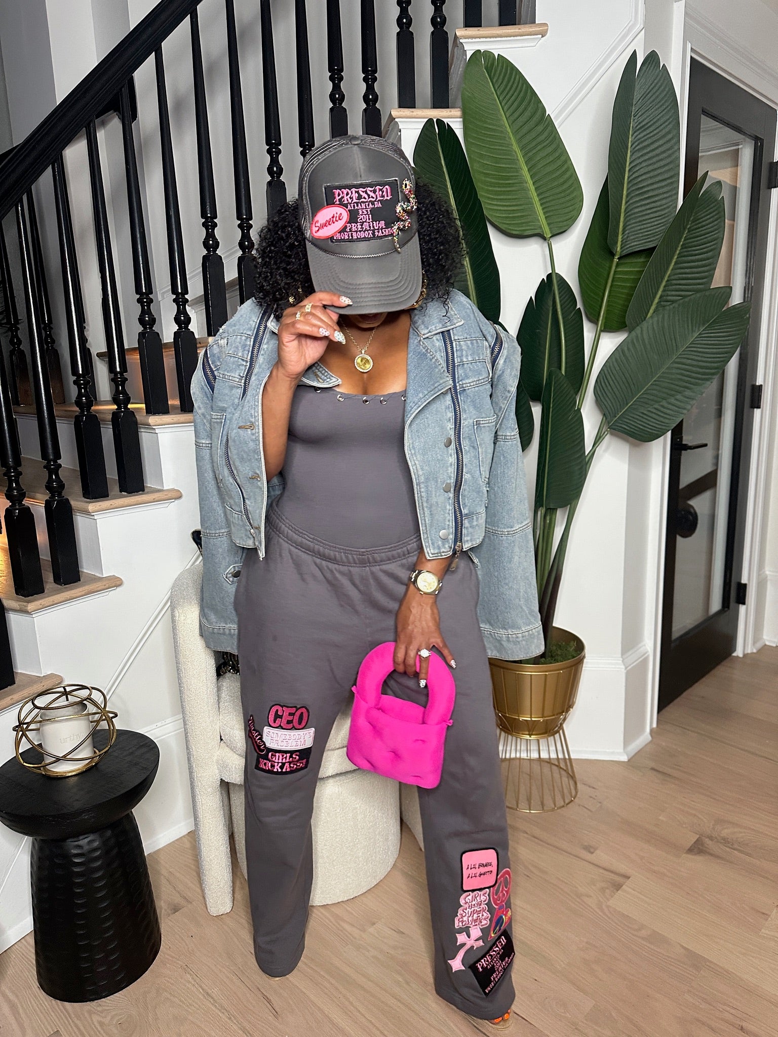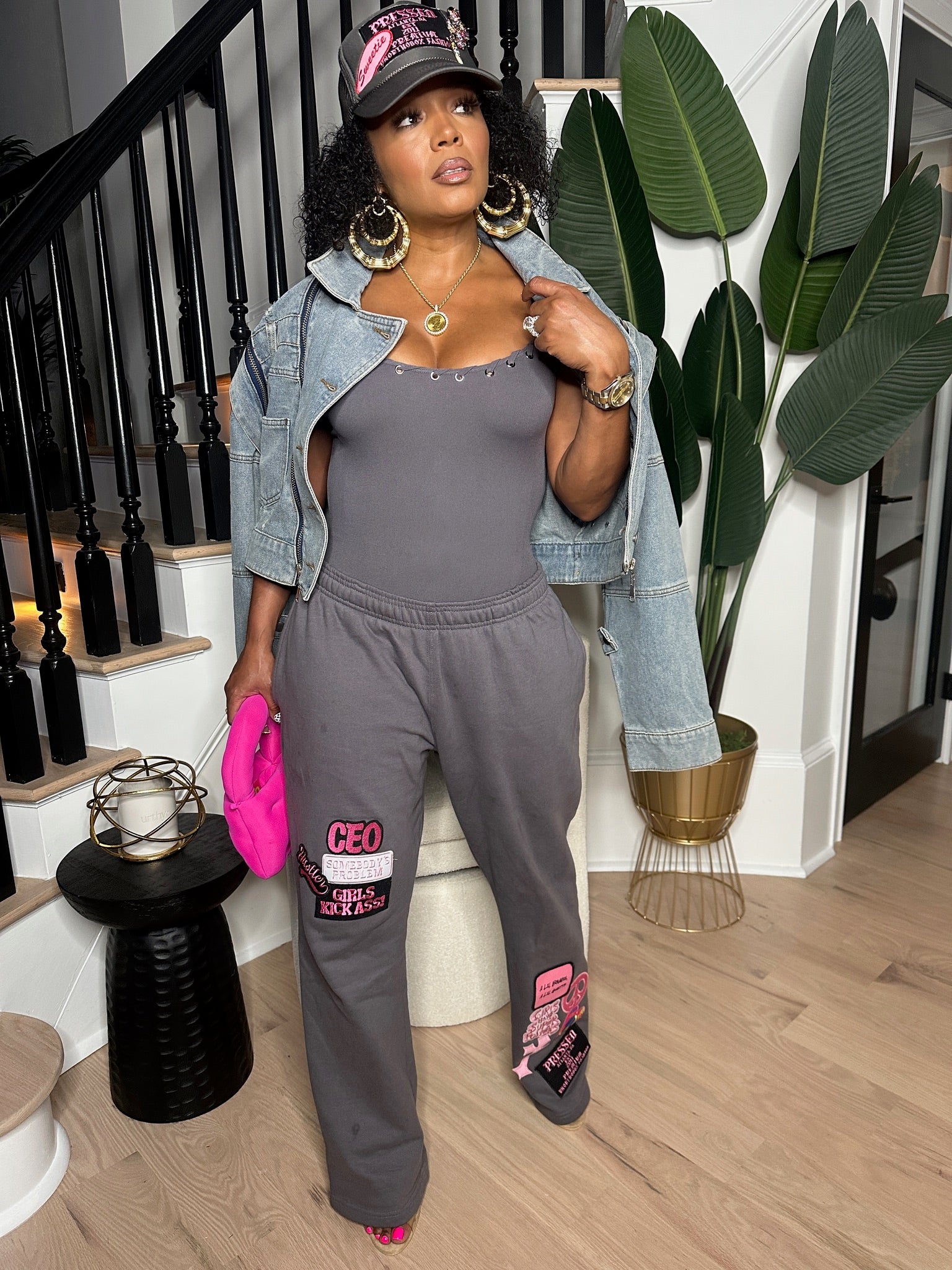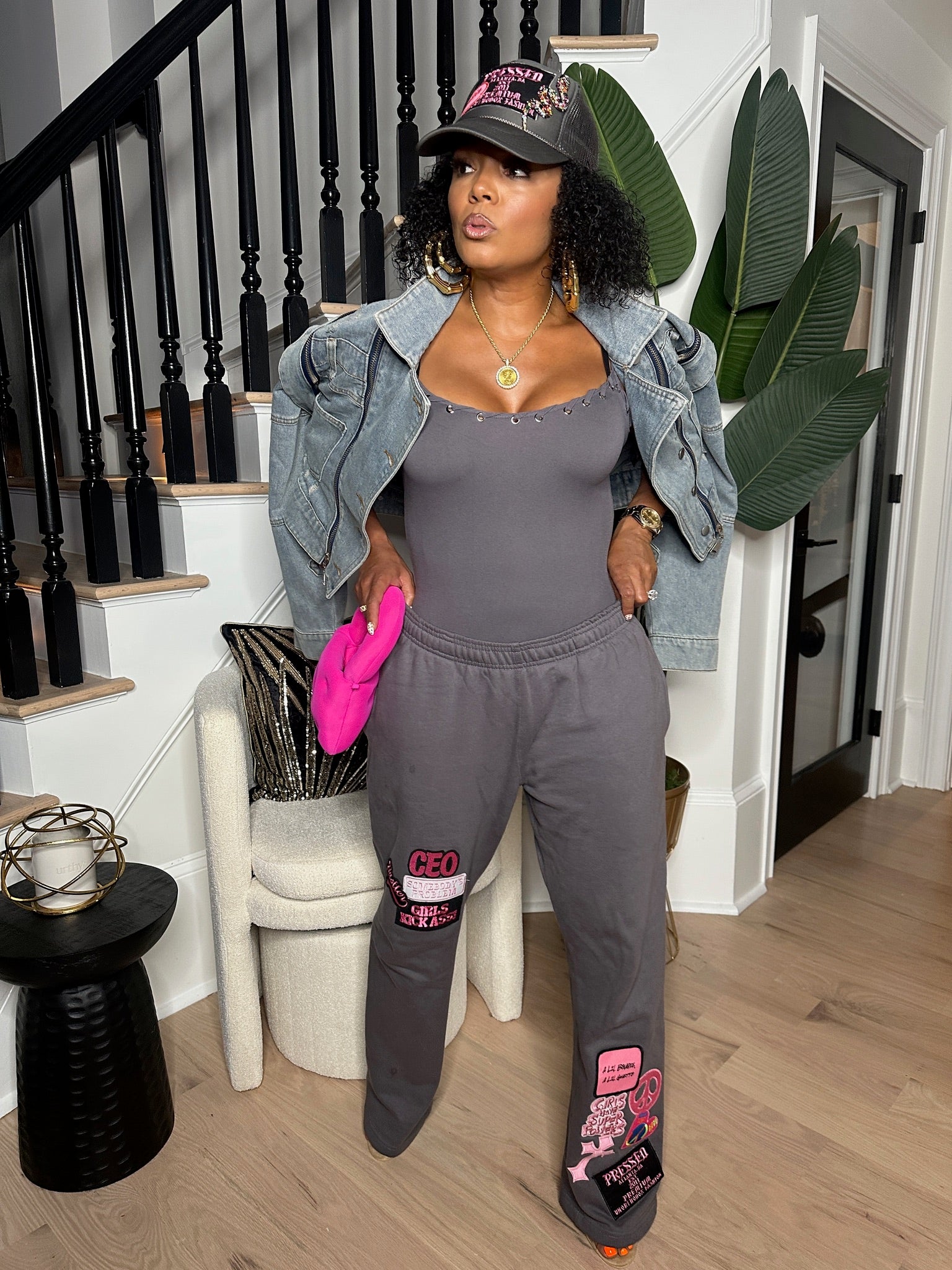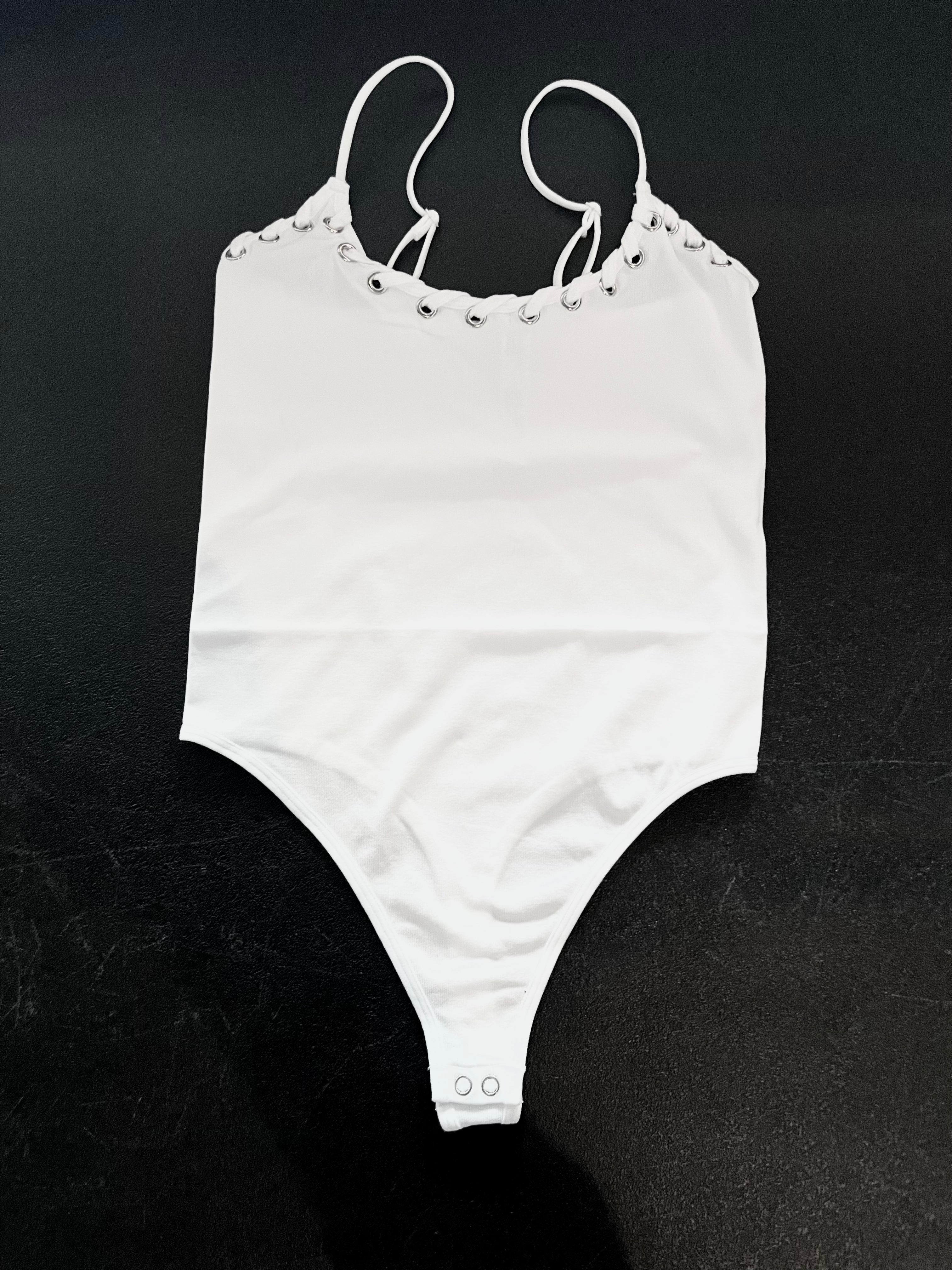 The Eyelet Bodysuit: Stretchy, Spaghetti strap and laced up detail. Model is wearing size S/M. Paired with the Patch Me Down Sweatpants.