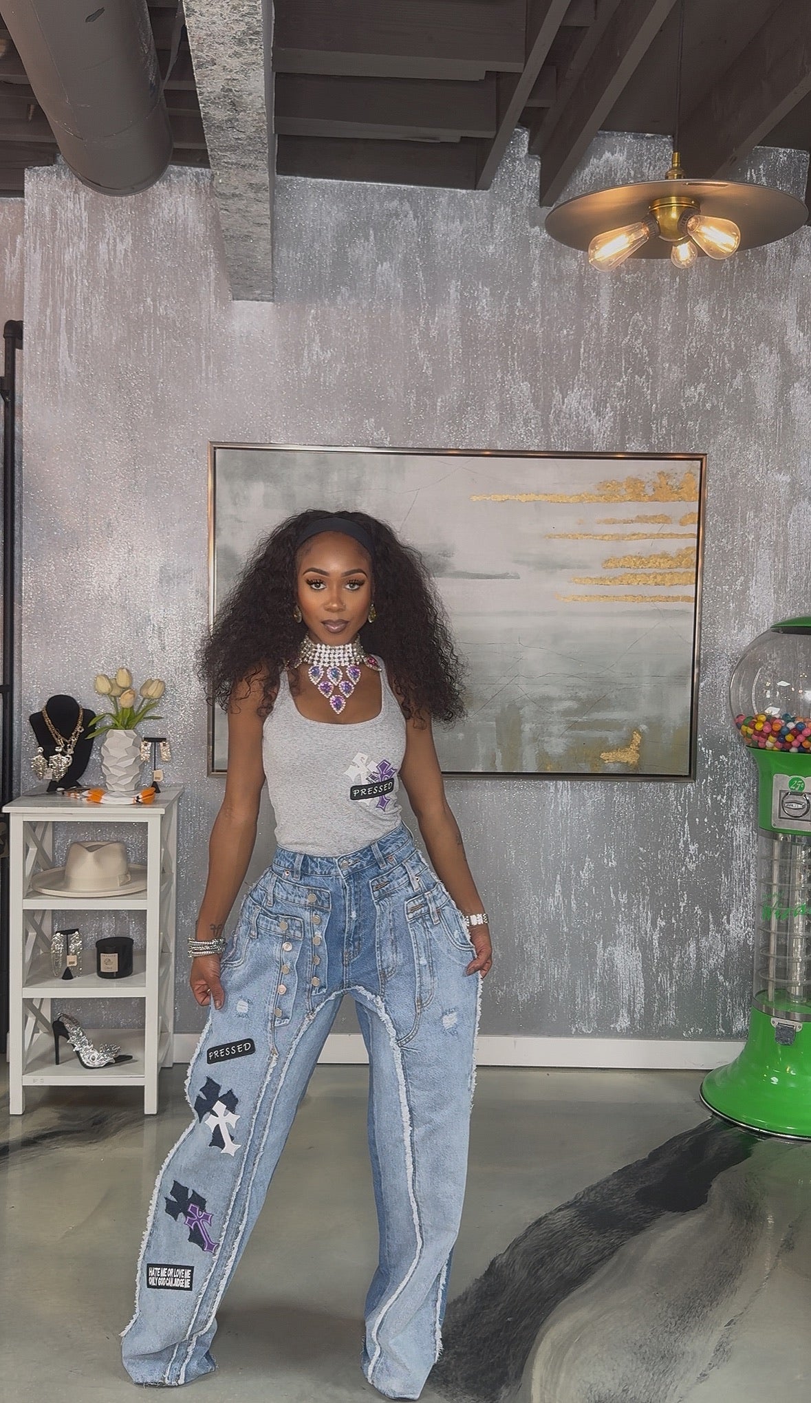 The Praise Me Set-2: 2pc set with wide leg jeans and matching design tee. Model is wearing size small. Jeans are non-stretch 99% cotton 1% spandex, tee is great stretch 95% polyester, 5% spandex. This is a custom Pressed Set ships out in 2-5 business days. Weekends and Holidays do not count as business days.