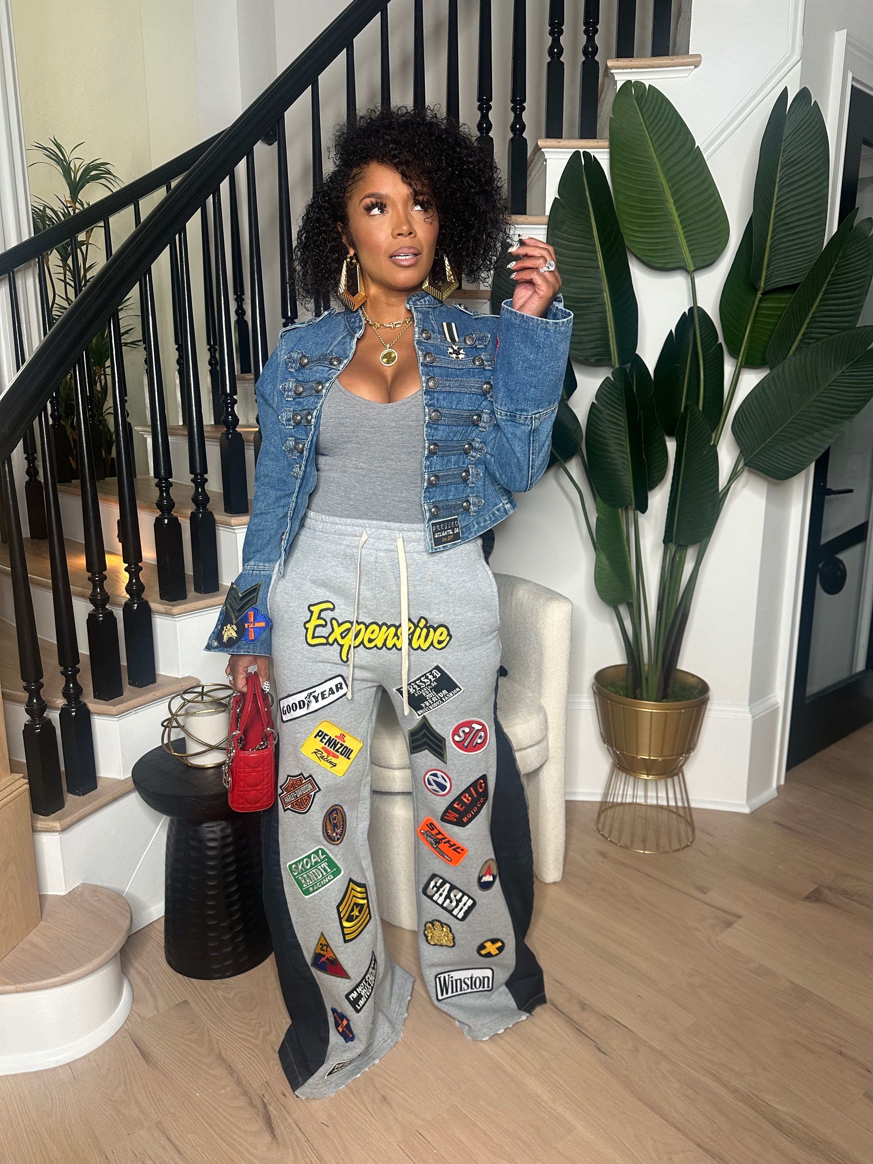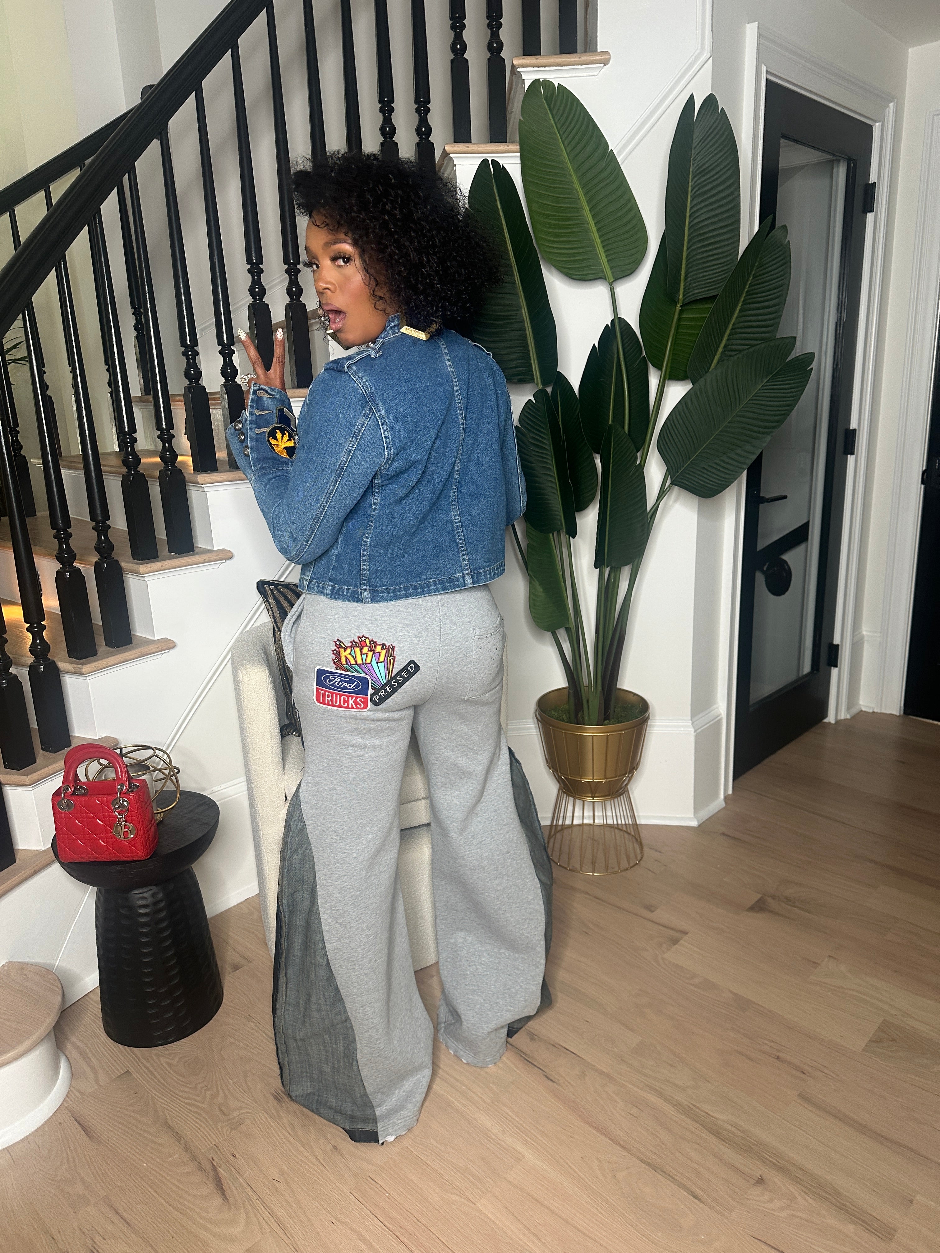 Total Patch Out Sweats: PRESSED EXCLUSIVE UNISEX non-stretch. Wide leg patch designs with denim side detail.