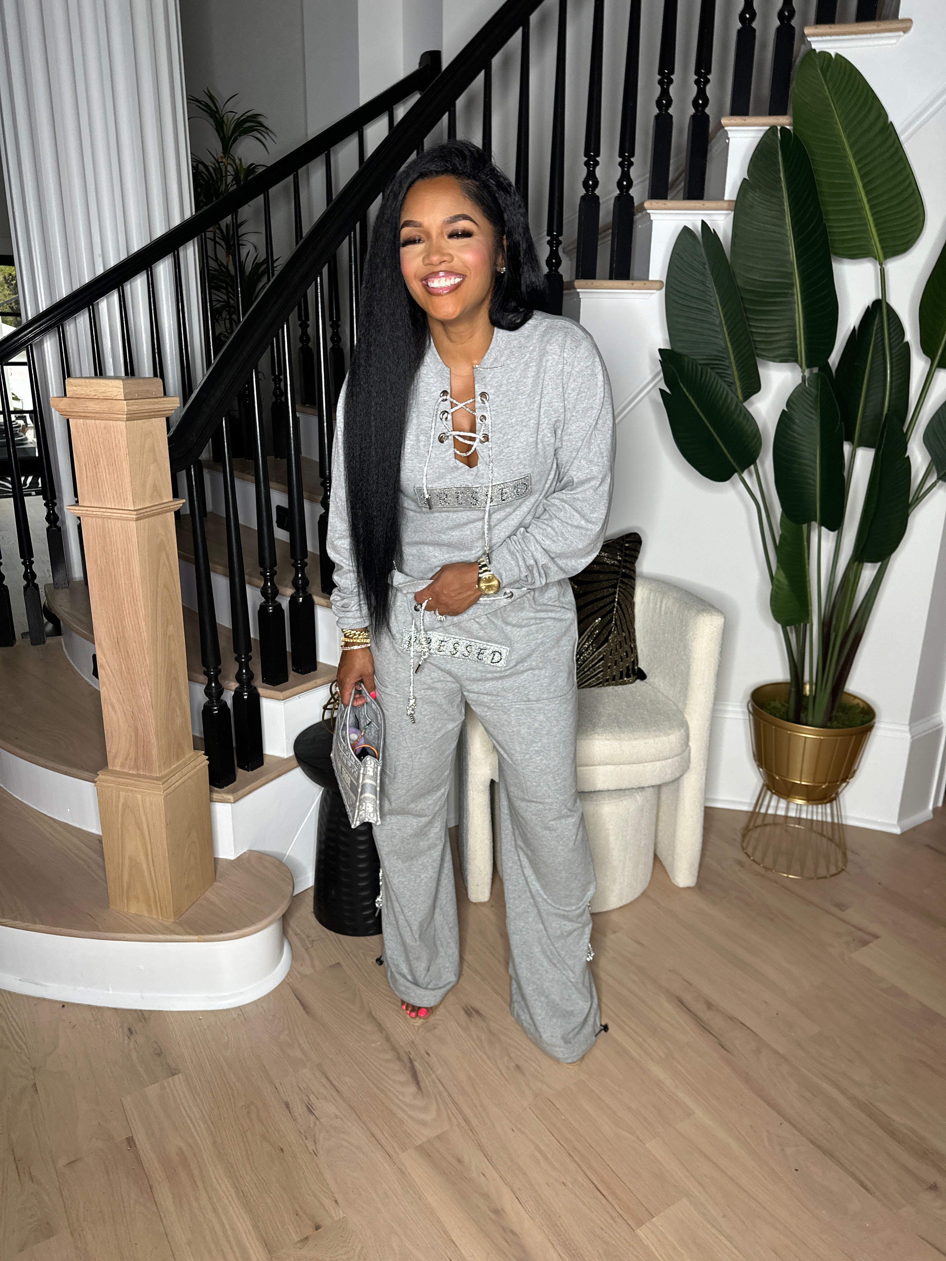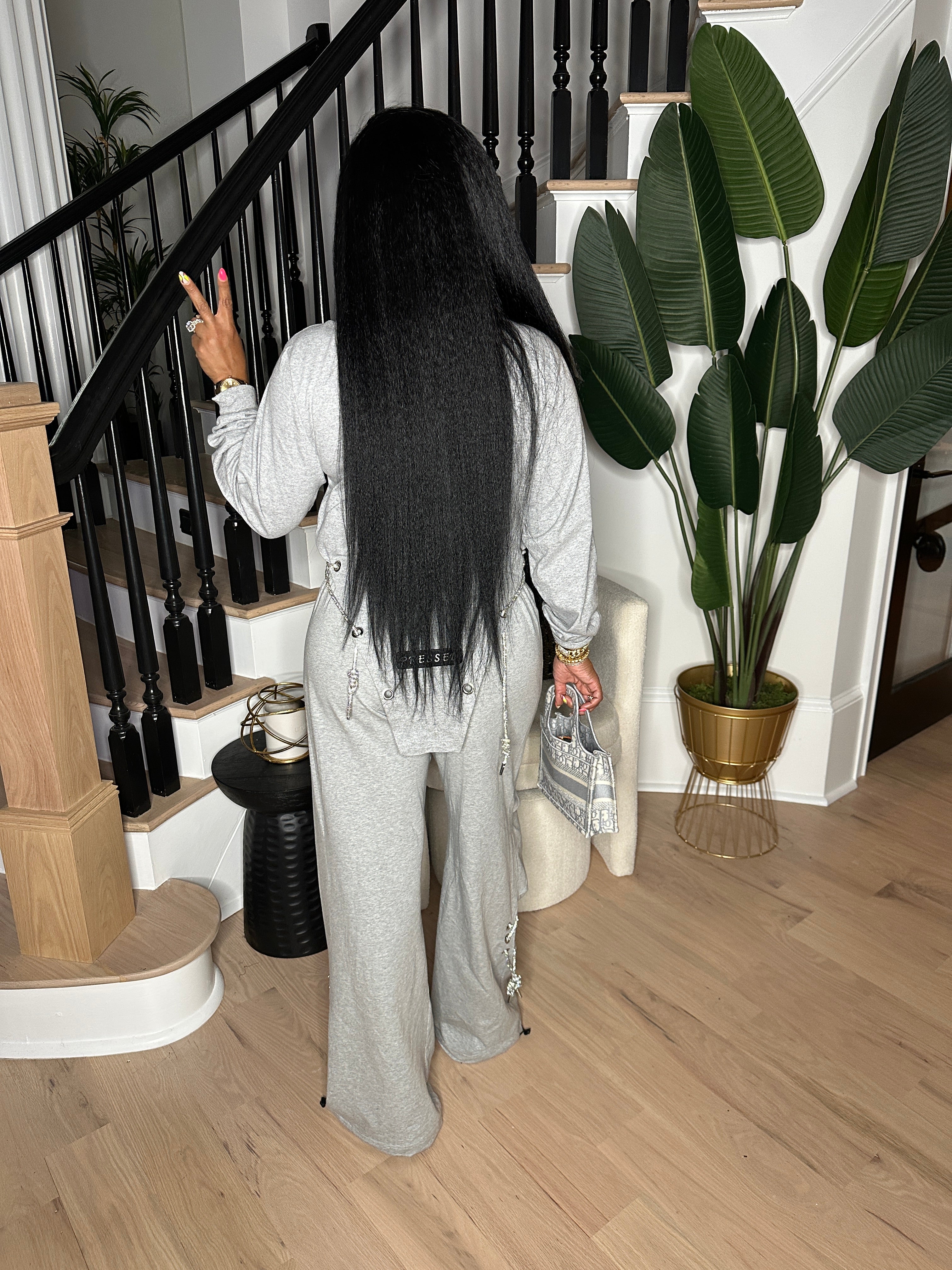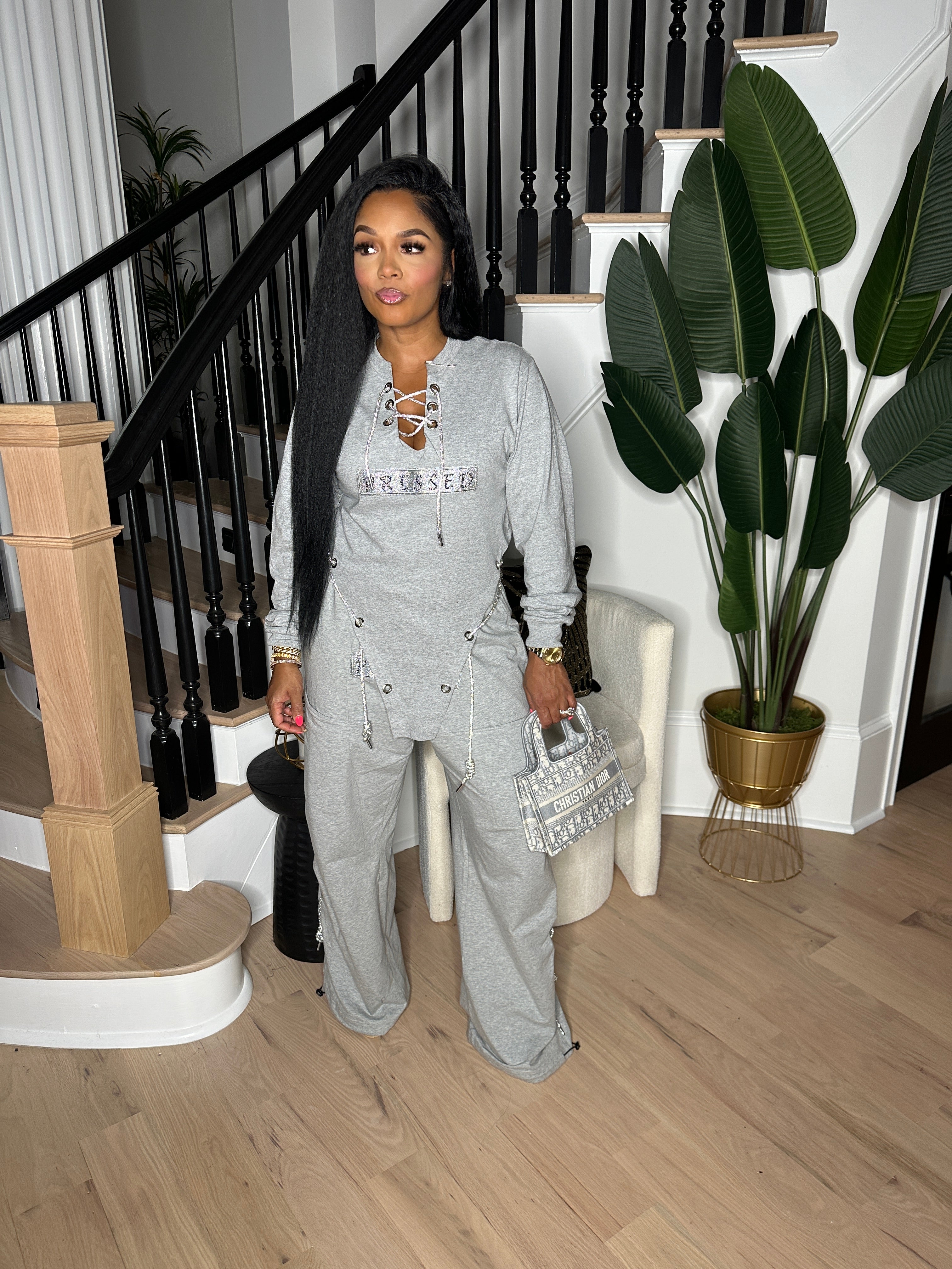 Pressed Gray Out Set: PRESSED EXCLUSIVE Great stretch: 2pc set, Top has V neck with bling string design & lower V cut with side bling string design. Top is 100% cotton. Pants have an elastic waist with pull string adjustment. Bottom of the pants can be worn as wide legs or has draw string to tighten. Pants are 92% cotton 8 % spandex