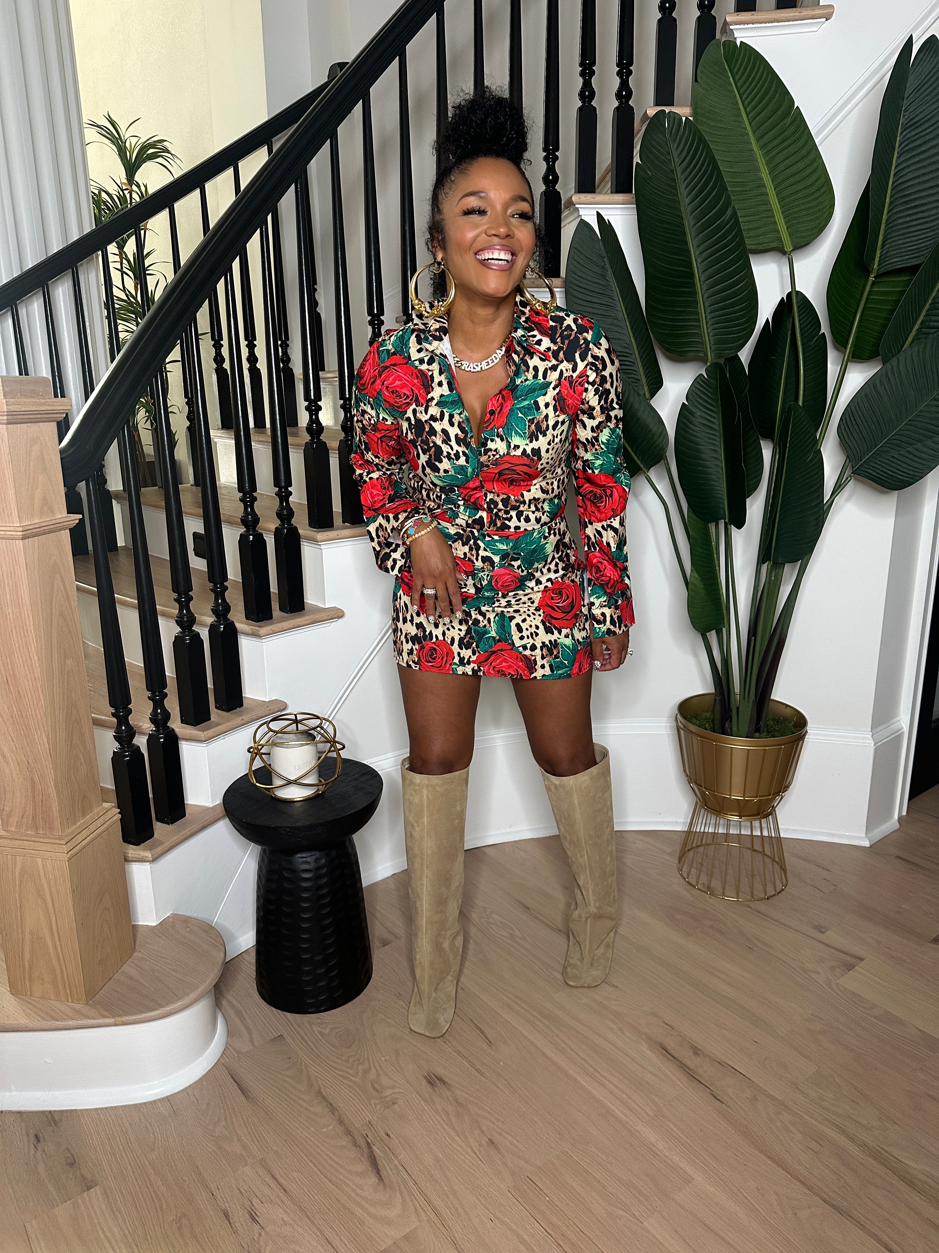 Cheetah Rose Skirt Set: 2 piece set, top and skirt. Skirt has back zipper opening with matching V neck top. Model is wearing size small. 95% polyester 5% elastane.
